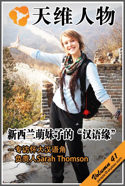 如今,Sarah Thomson终于回到了自己的“本职工作”——怀卡托大学的学生,但她的“中国梦”却并没有结束。现在的Sarah Thomson仍然会听很多中文歌,阅读大量中国新闻,“skykiwi也是我常常看的网站哦!”说罢,她在电话那头发出一阵爽朗的笑声。她喜欢听齐秦、张学友的歌,不久前她才看完了中国电影《人在囧途》,“我觉得很好看啊,特别好笑。”